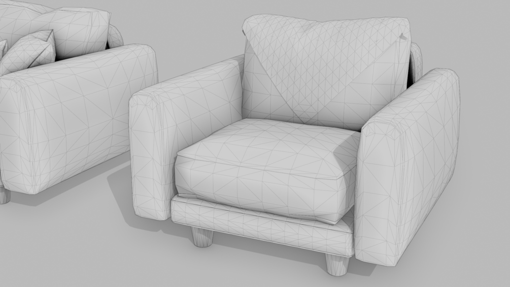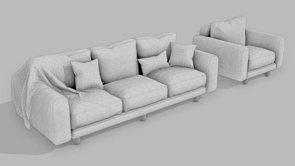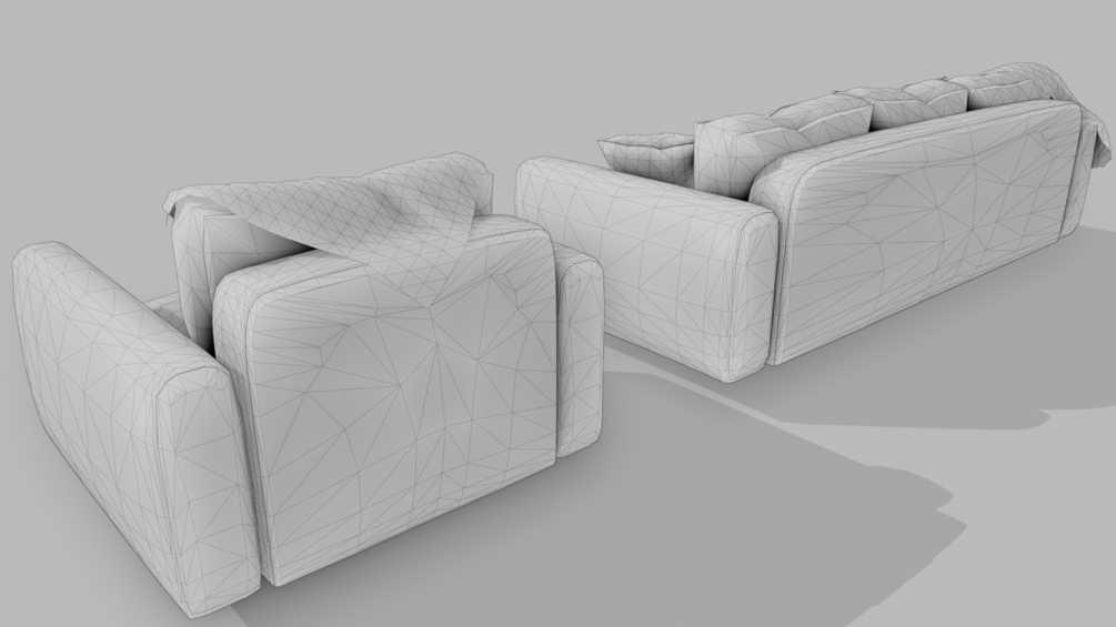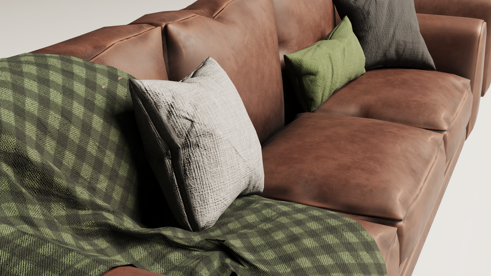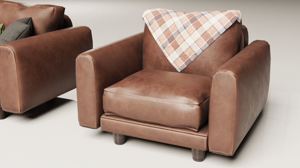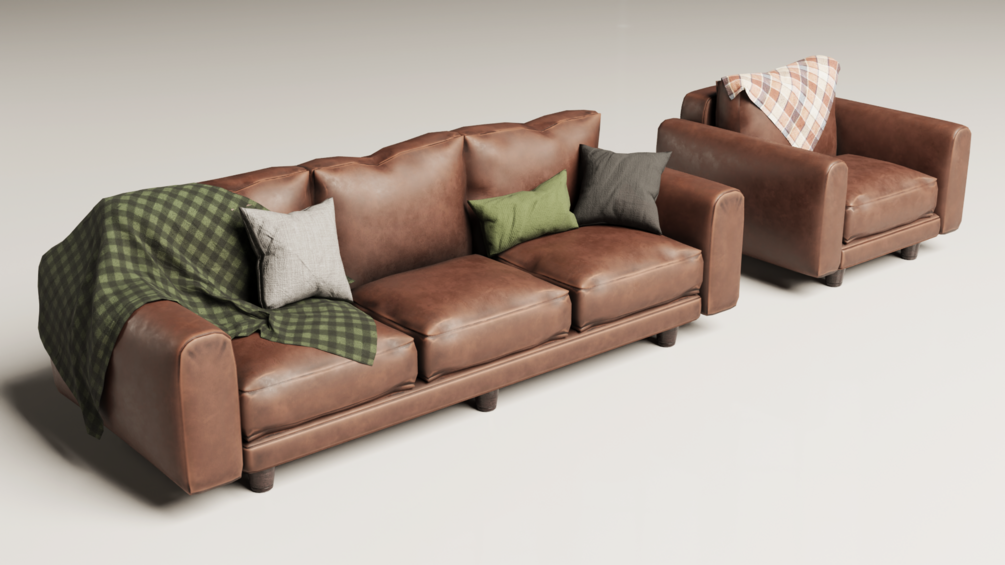 This detailed 3D model captures the essence of a vintage 1980s brown leather sofa set, complete with a matching armchair. The set includes decorative cushions in various colors, along with cozy blankets—one in a green checkered pattern and the other in a warm-toned geometric design. Perfect for creating retro-themed interiors or adding a nostalgic yet comfortable touch to your projects.
